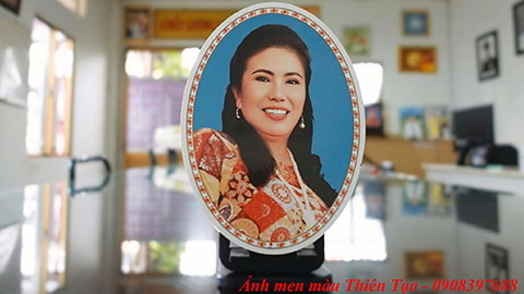 Trong hình là một tác phẩm ảnh men màu cao cấp Thiên Tạo, được phục dựng từ ảnh gốc với kỹ thuật chỉnh sửa chân dung tiên tiến, giữ nguyên thần thái, nụ cười và ánh nhìn sống động.