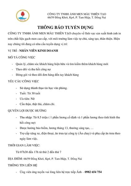 CÔNG TY TNHH ẢNH MEN MÀU THIÊN TẠO chuyên về lĩnh vực sản xuất hình ảnh in trên chất liệu gạch men cao cấp, với môi trường làm việc tự chủ, sáng tạo, thân thiện. Hiện nay chúng tôi đang có nhu cầu tuyển dụng vị trí: